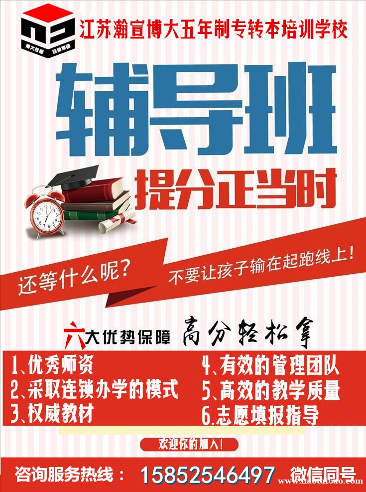 江苏瀚宣博大专转本全科辅导五年制专转本统考科目英语和主考院校所有专业考试科目,并按照考生不同基础制定不同教学计划,不同阶段制定不同教学安排,一切以提高学员基础水平和知识能力为首.要前提,让同学们能够做到先打基础再提优拔高,稳步提升成绩的目的!并根据考生的不同基础情况及月考成绩、测试成绩、模拟考成绩综合考虑(瀚宣博大专转本每月有月考测试,每阶段有小测试,每年有大型模拟考,集合瀚宣博大各城市校区考生及意向转本的考生设置的大型模拟考),提供五年制专转本考试政策的专业咨询、主考院校专业的详细介绍、统一报名、送考、志愿填报指导等服务,全力助力考生成功转本,圆本科梦!更多详情及预约免费测试或试听联系瀚宣博大专转本王老师158(微)5254(同)6497。年终优惠超乎你想象!!!